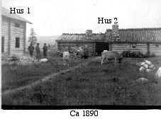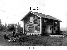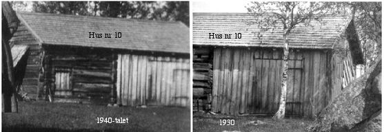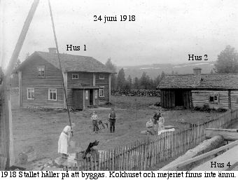 Jag tror att den timrade delen till vänster på fotot är den ursprungliga stugan. Där var tydligen en spis i hörnet och ett litet rum längst till vänster. Den delen är riven och borta. Ev finns gaveln kvar. Gammelstugan hade ursprungligen kluvor på taket. Den kvarvarande delen byggdes på med 3 stockvarv och fönstren byttes till större fönster. Det arbetet var troligen klart 1903. Under ett fönsterfoder står det K.P. Eriksson, Leksand 19/6 1903. På fotot från 1905 ser man att de byggt ut ett nytt pärt-tak över en del av den gamla timmerstugan. Den revs senare och ett skjule av brädor byggdes under taket.